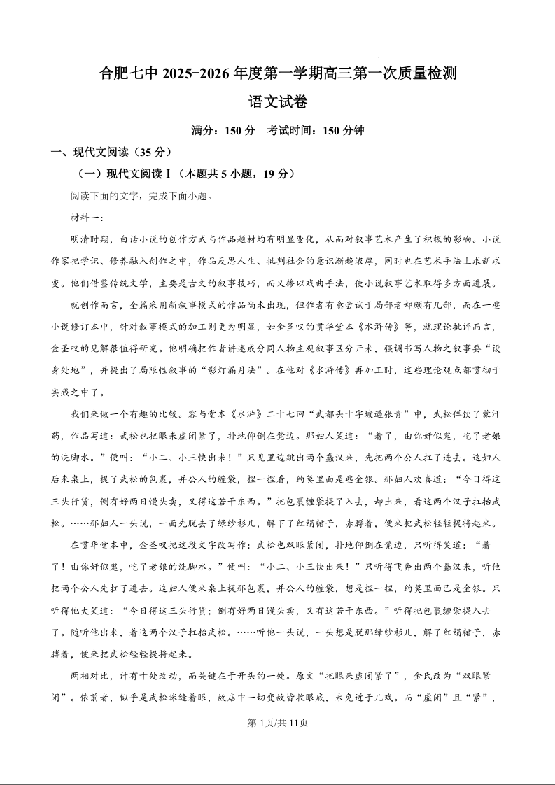 安徽省合肥市第七中学2026届高三上学期第一次质量检测 语文.docx