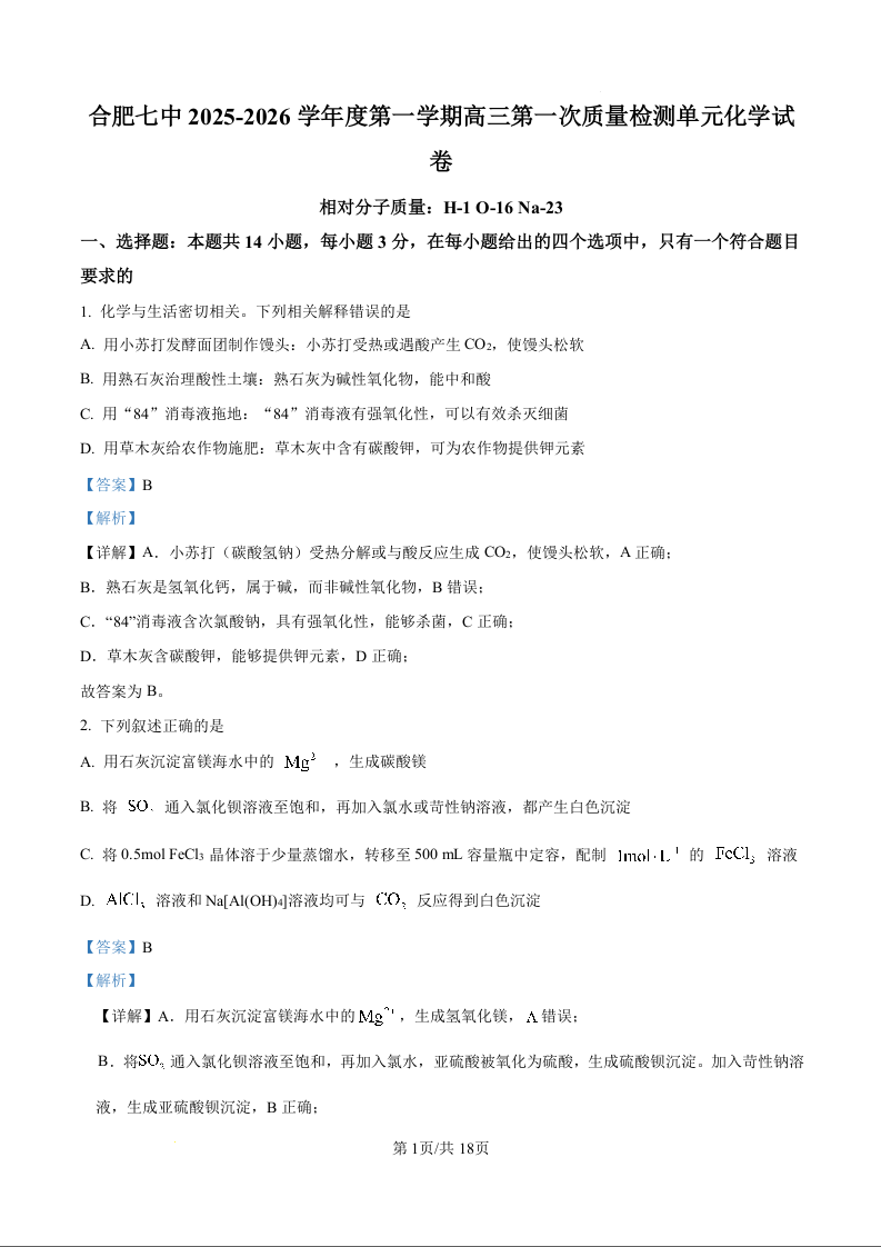 安徽省合肥市第七中学2026届高三上学期第一次质量检测 化学答案.docx