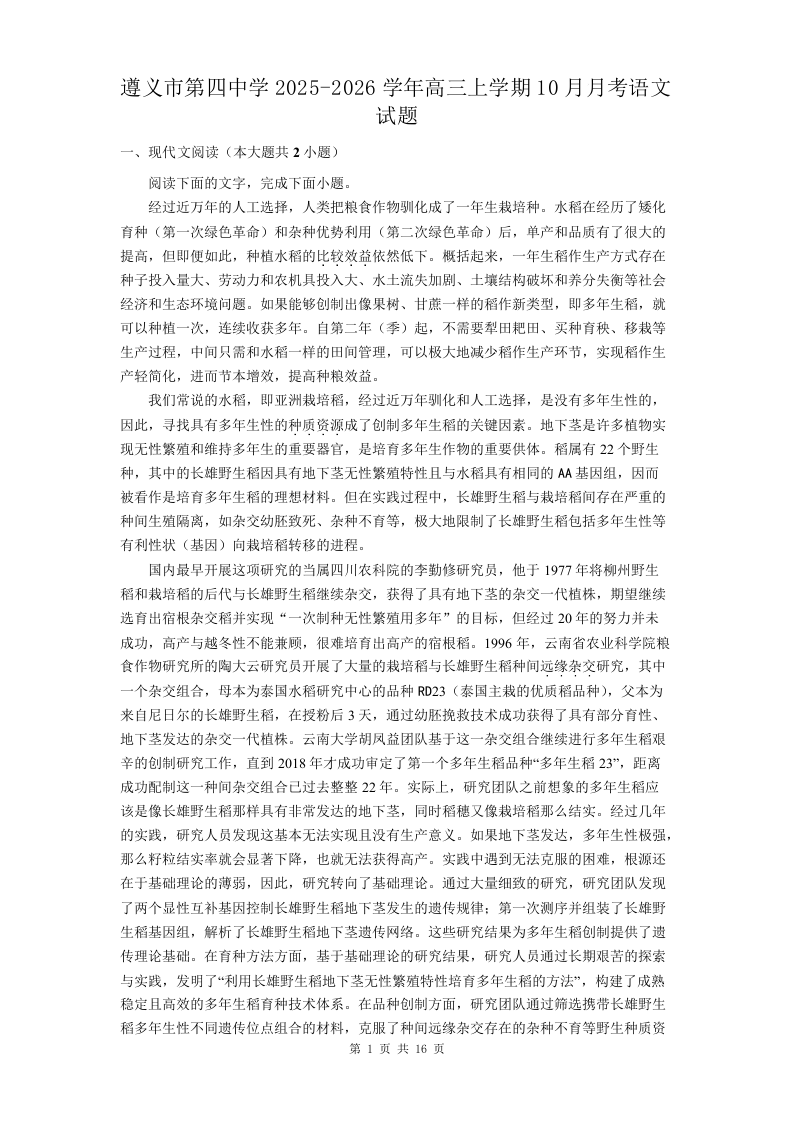 贵州省遵义市第四中学2026届高三上学期10月月考 语文试题(含答案).docx