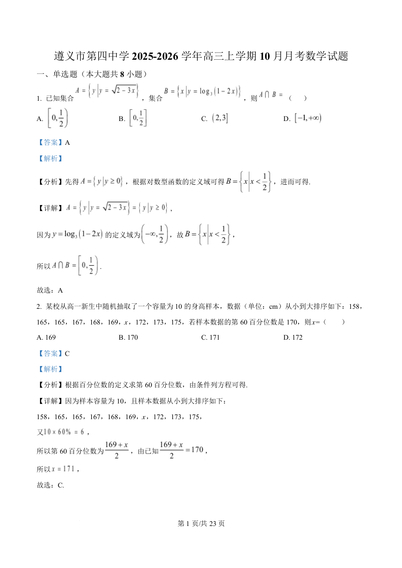贵州省遵义市第四中学2026届高三上学期10月月考 数学答案.docx