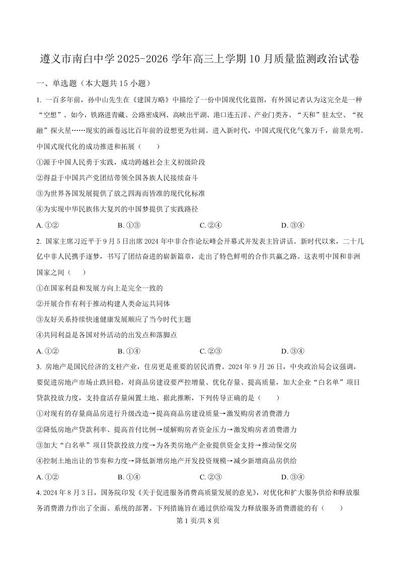 贵州省遵义市南白中学2026届高三上学期10月月考 政治.docx