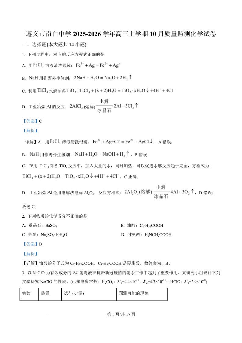 贵州省遵义市南白中学2026届高三上学期10月月考 化学答案.docx
