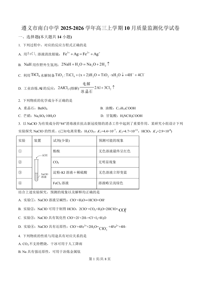 贵州省遵义市南白中学2026届高三上学期10月月考 化学.docx