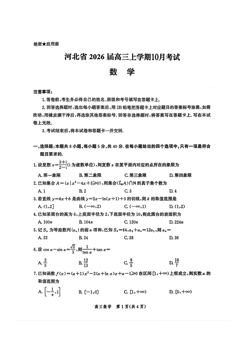 河北省2026届高三年级一轮复习阶段性质量检测 数学.pdf