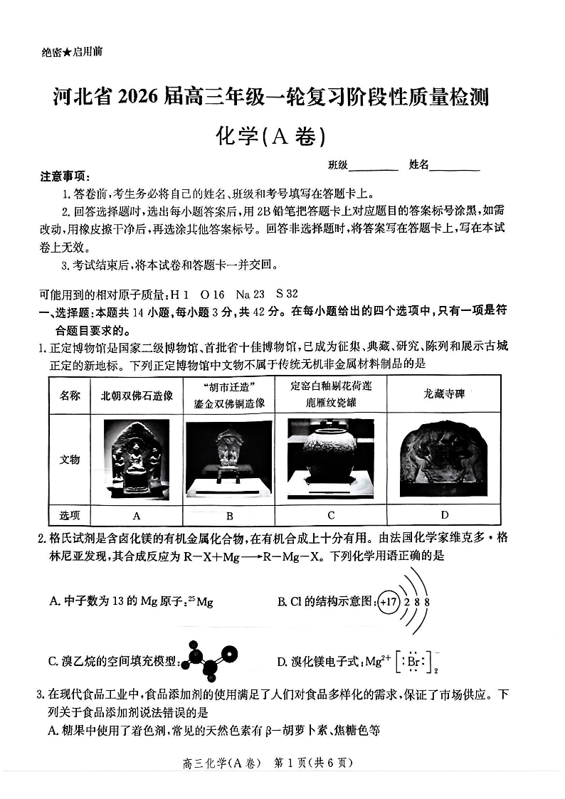 河北省2026届高三年级一轮复习阶段性质量检测 化学.pdf