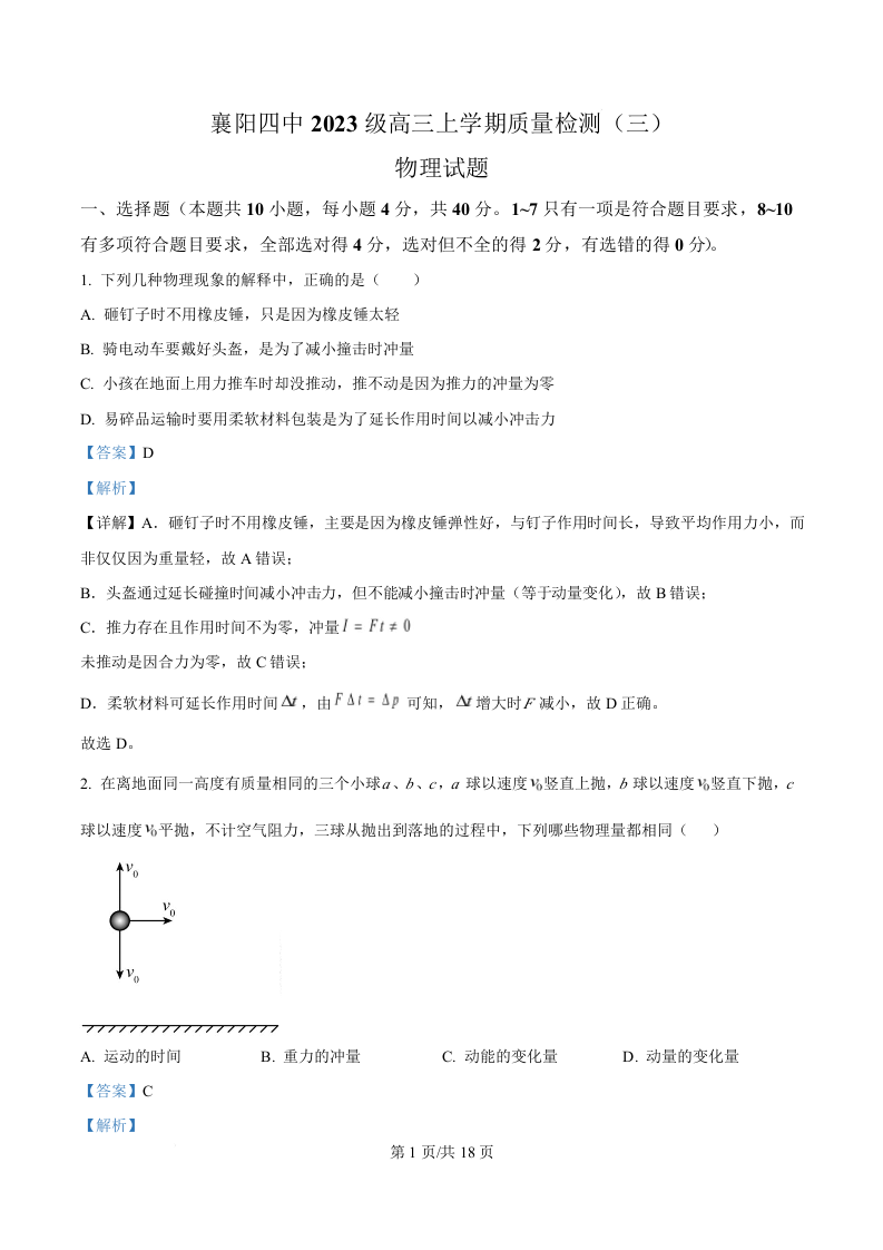 湖北省襄阳市第四中学2026届高三上学期10月月考 物理答案.docx
