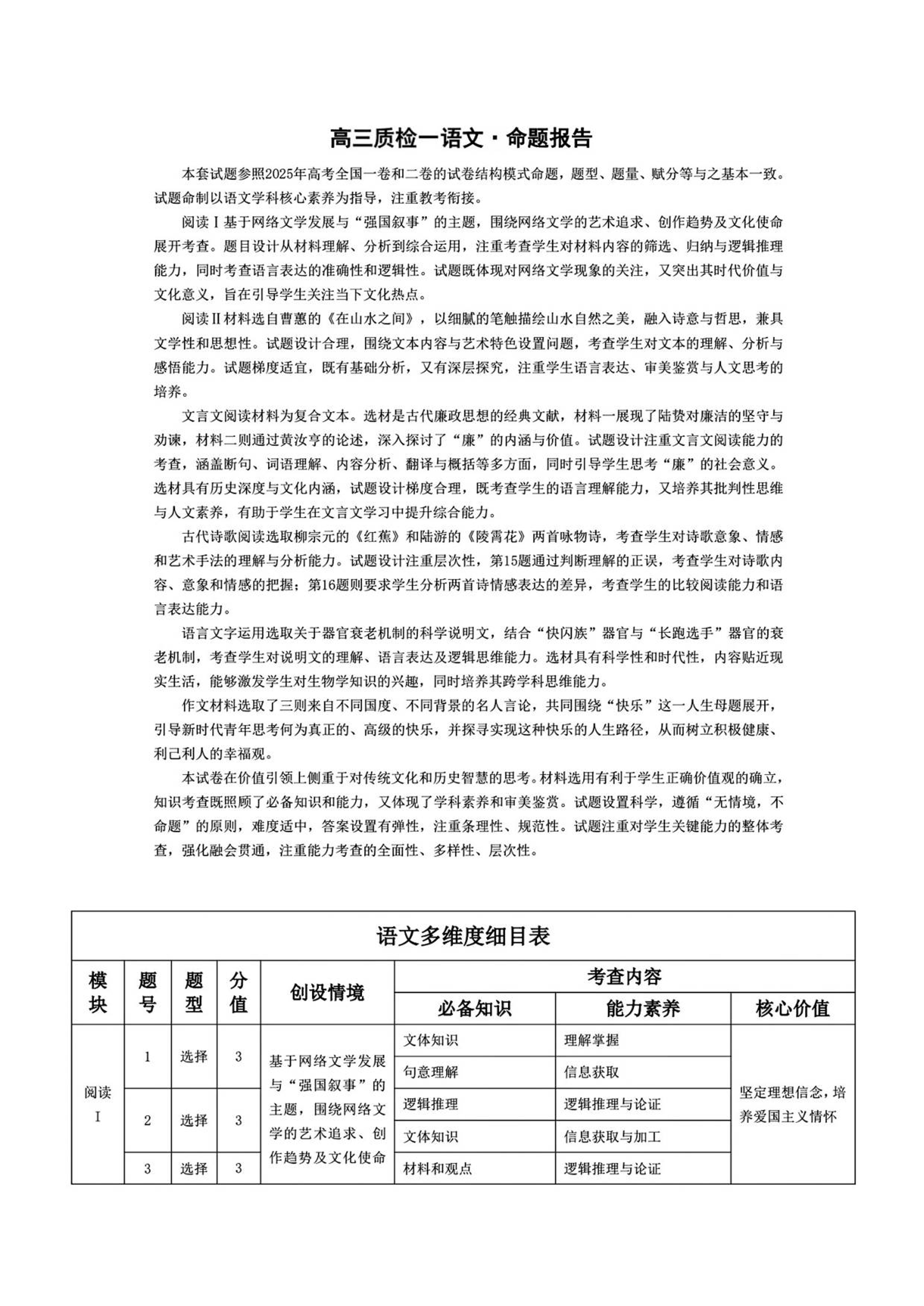 湖南省2025-2026学年(上)湘一名校联盟高三质检(一)语文命题报告.pdf