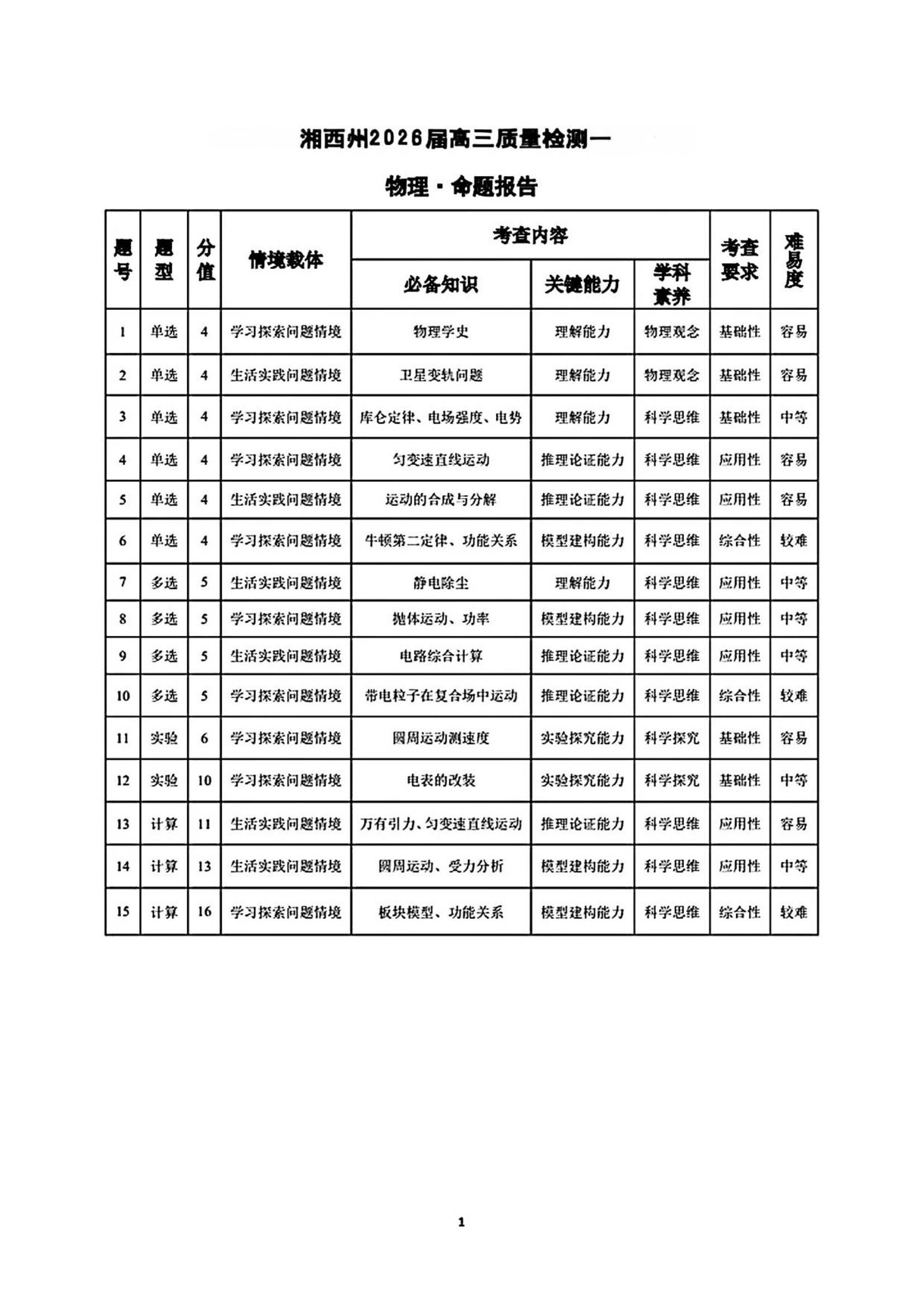 湖南省2025-2026学年(上)湘一名校联盟高三质检(一)物理命题报告.pdf