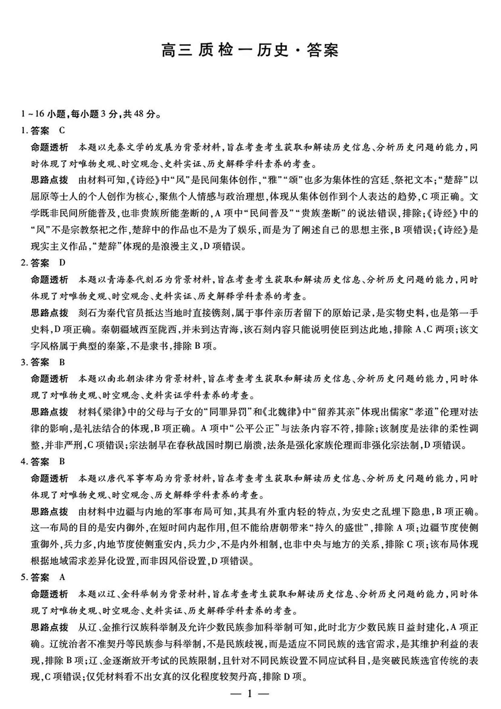 湖南省2025-2026学年(上)湘一名校联盟高三质检(一)历史答案.pdf