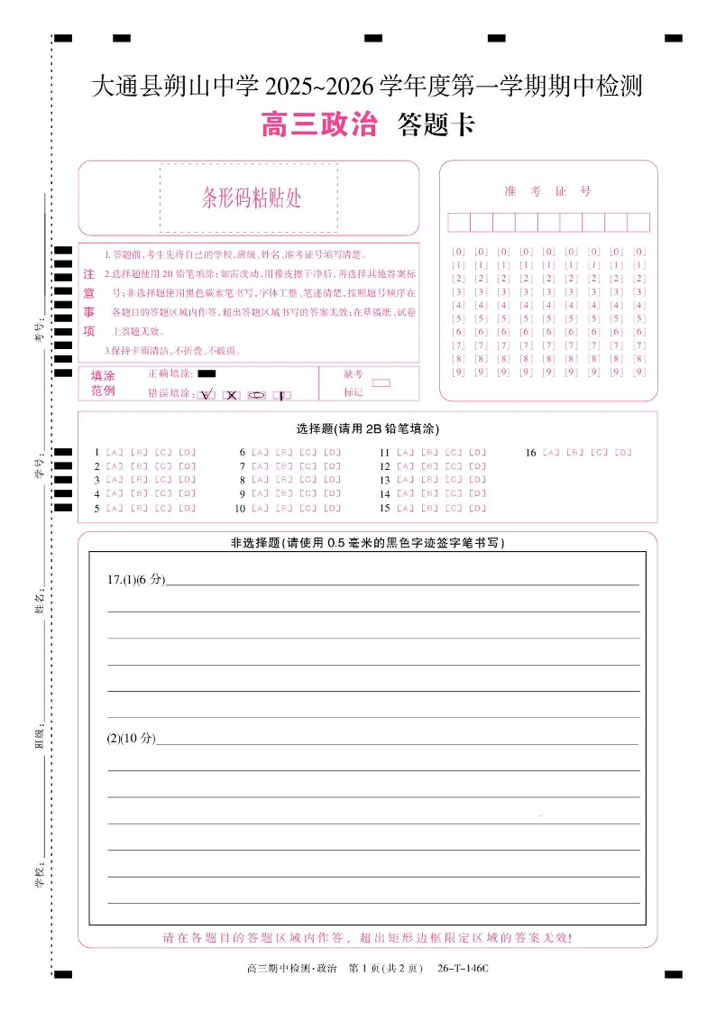 大通县朔山中学2025~2026学年度第一学期期中检测 政治答题卡.pdf