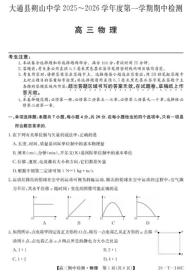 大通县朔山中学2025~2026学年度第一学期期中检测 物理.pdf