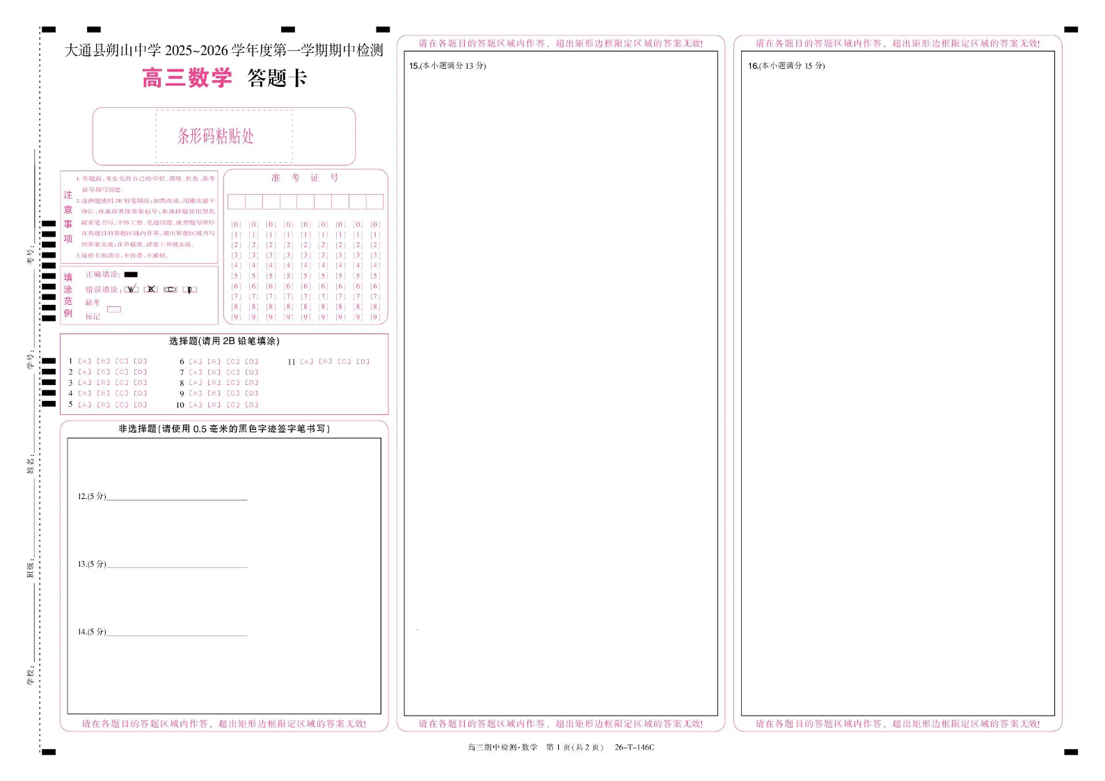 大通县朔山中学2025~2026学年度第一学期期中检测 数学答题卡.pdf
