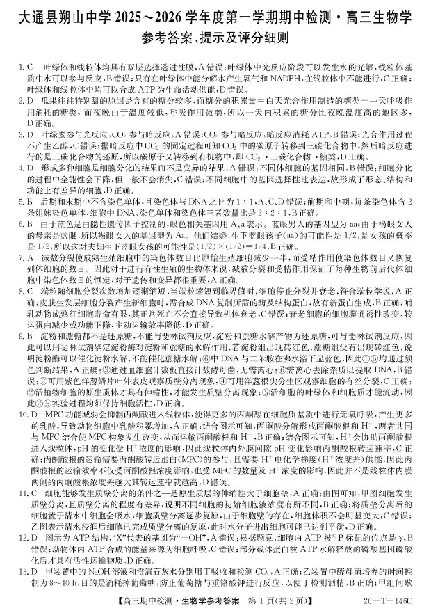 大通县朔山中学2025~2026学年度第一学期期中检测 生物答案.pdf