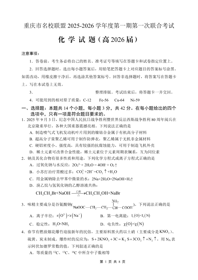 重庆市名校联盟2025-2026学年度第一期第一次联合考试 化学.pdf