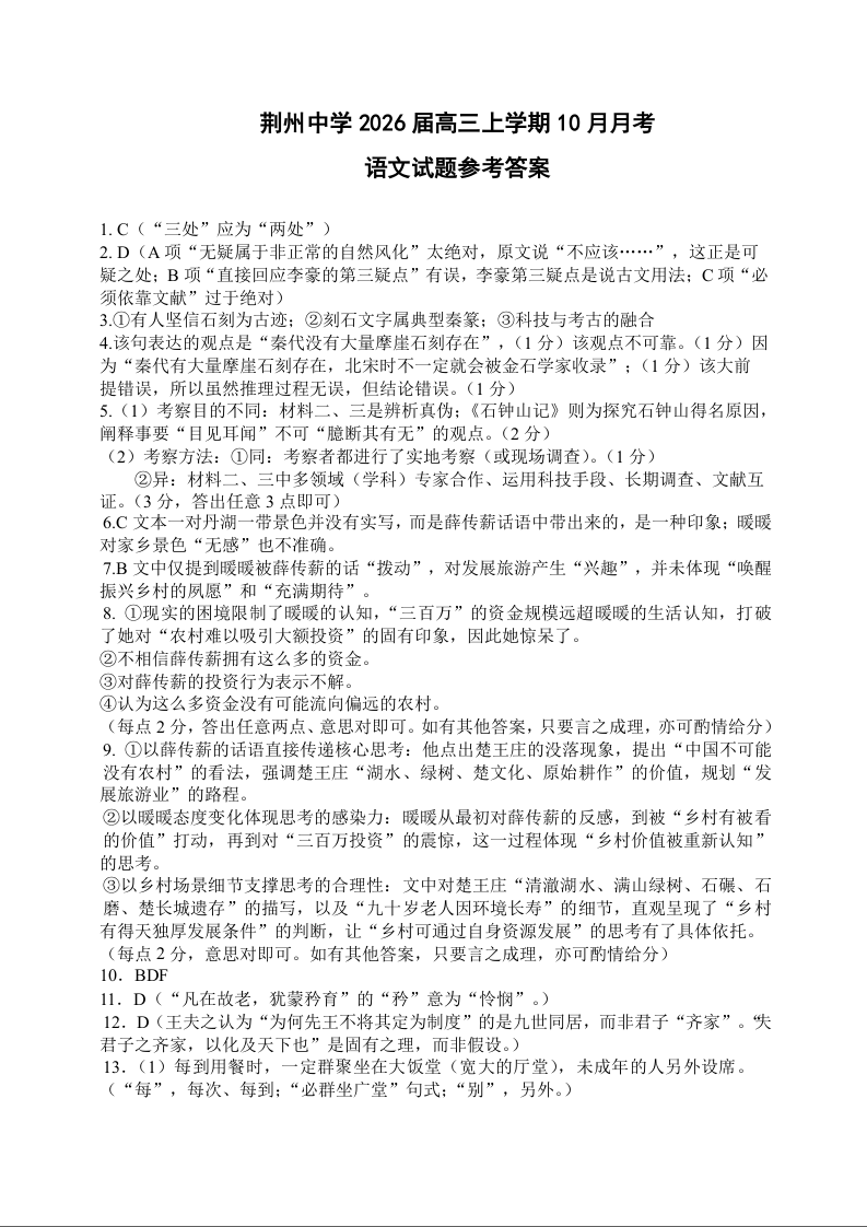 荆州中学2025-2026学年秋季学期高三年级10月月考 语文答案.docx
