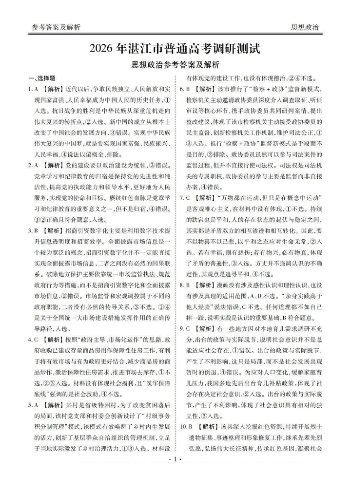广东省湛江市2026年普通高考调研测试 政治答案.pdf
