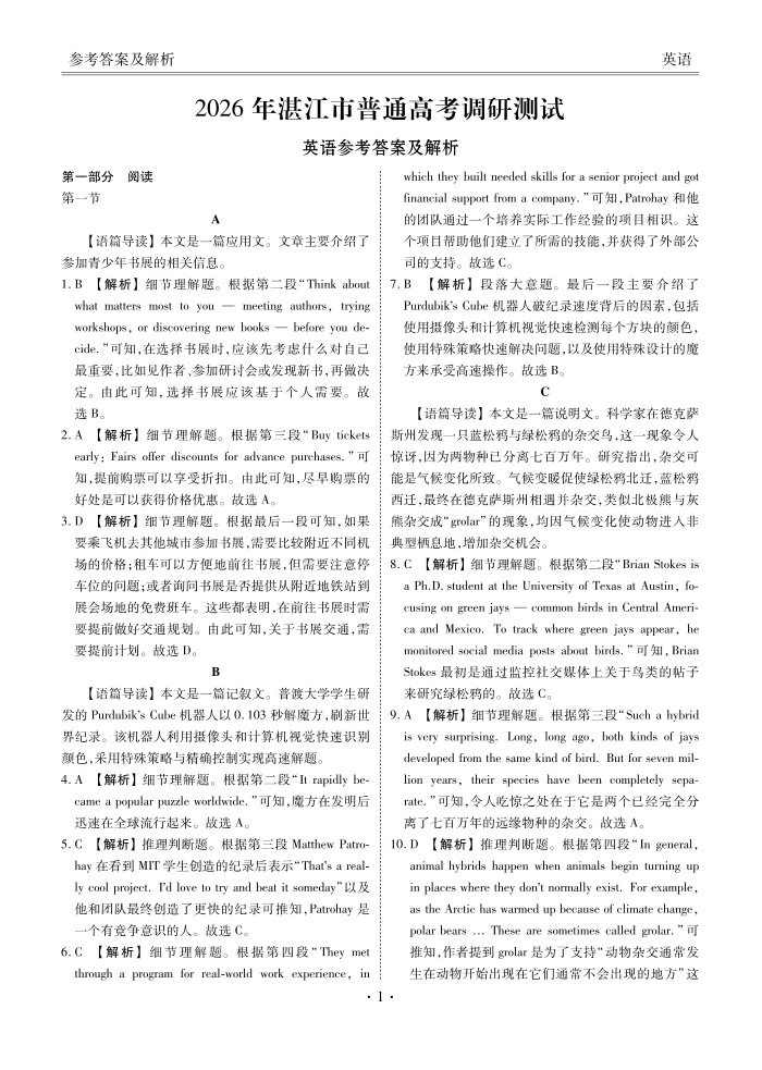 广东省湛江市2026年普通高考调研测试 英语答案.pdf