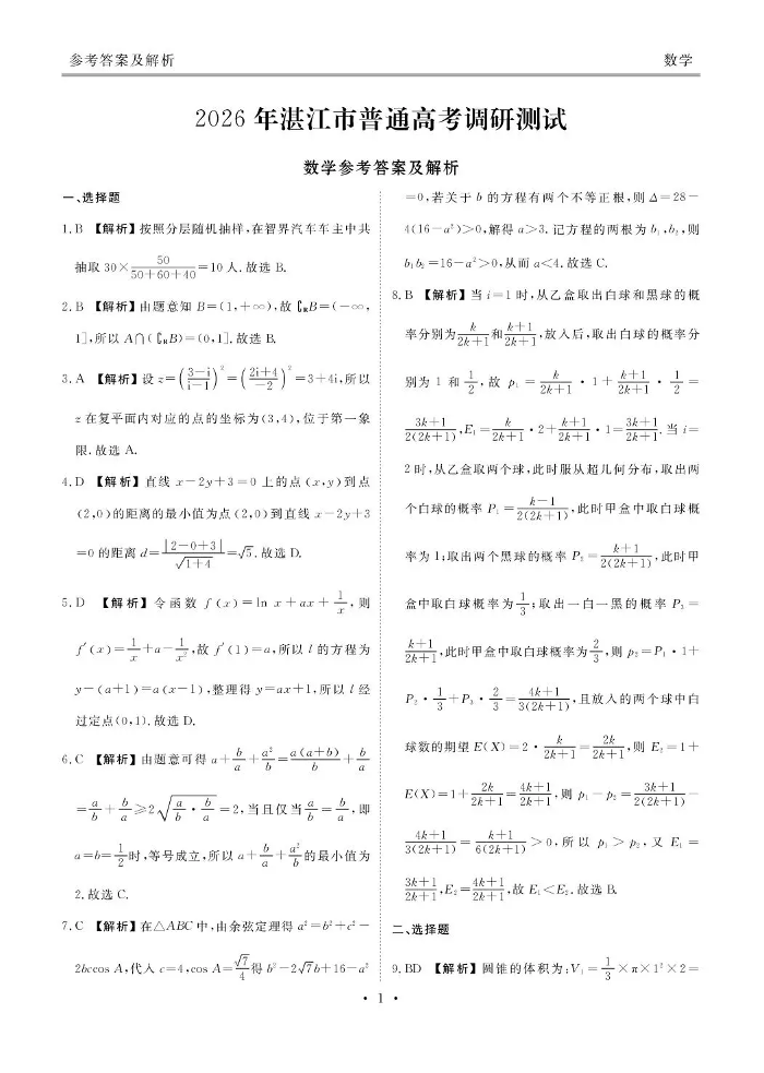 广东省湛江市2026年普通高考调研测试 数学答案.pdf