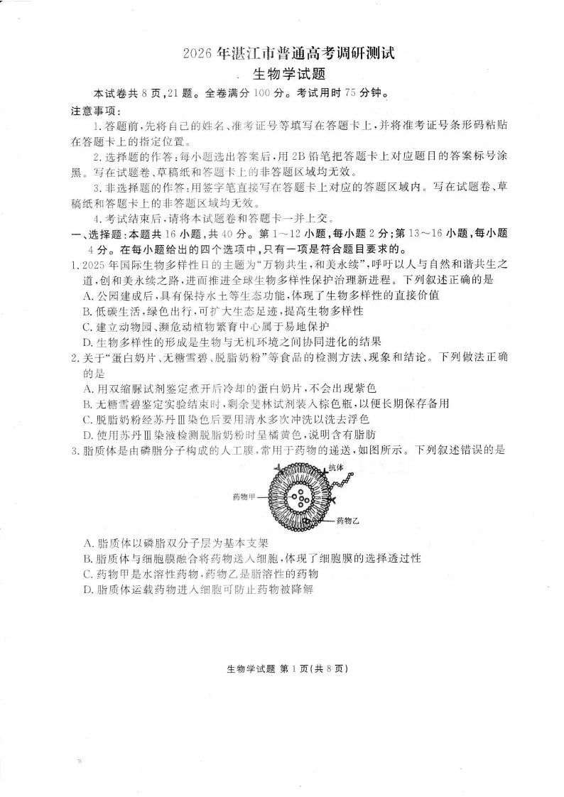 广东省湛江市2026年普通高考调研测试 生物.pdf