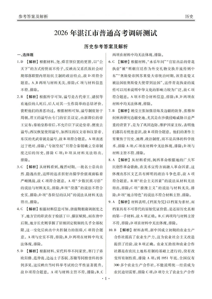 广东省湛江市2026年普通高考调研测试 历史答案.pdf
