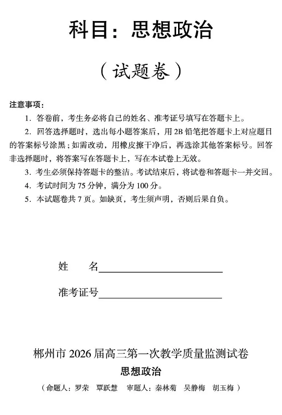 郴州市2026届高三第一次教学质量监测试卷 政治.pdf
