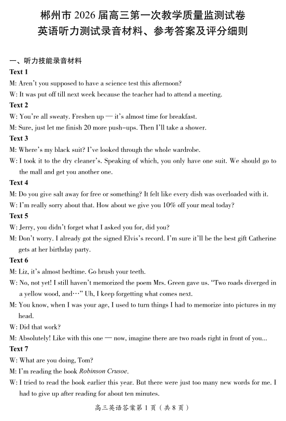 郴州市2026届高三第一次教学质量监测试卷 英语答案.pdf