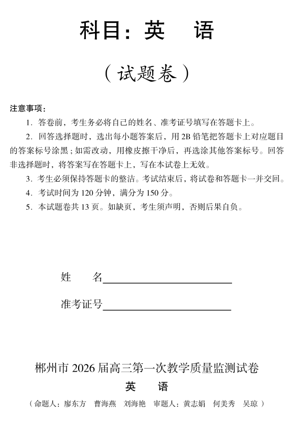 郴州市2026届高三第一次教学质量监测试卷 英语.pdf