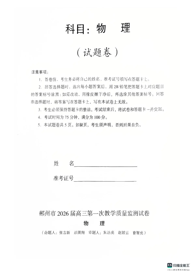 郴州市2026届高三第一次教学质量监测试卷 物理.pdf