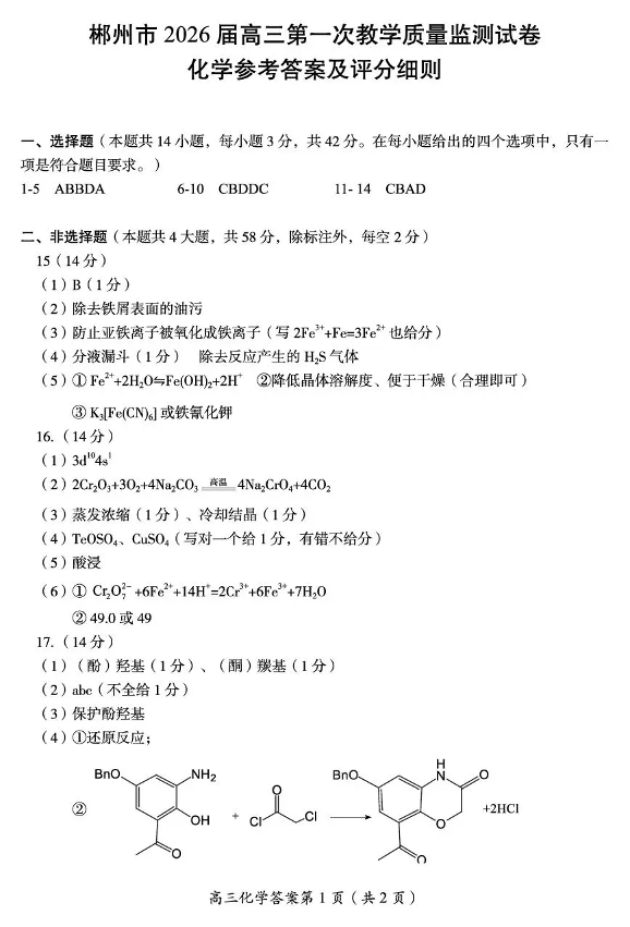 郴州市2026届高三第一次教学质量监测试卷 化学答案.pdf