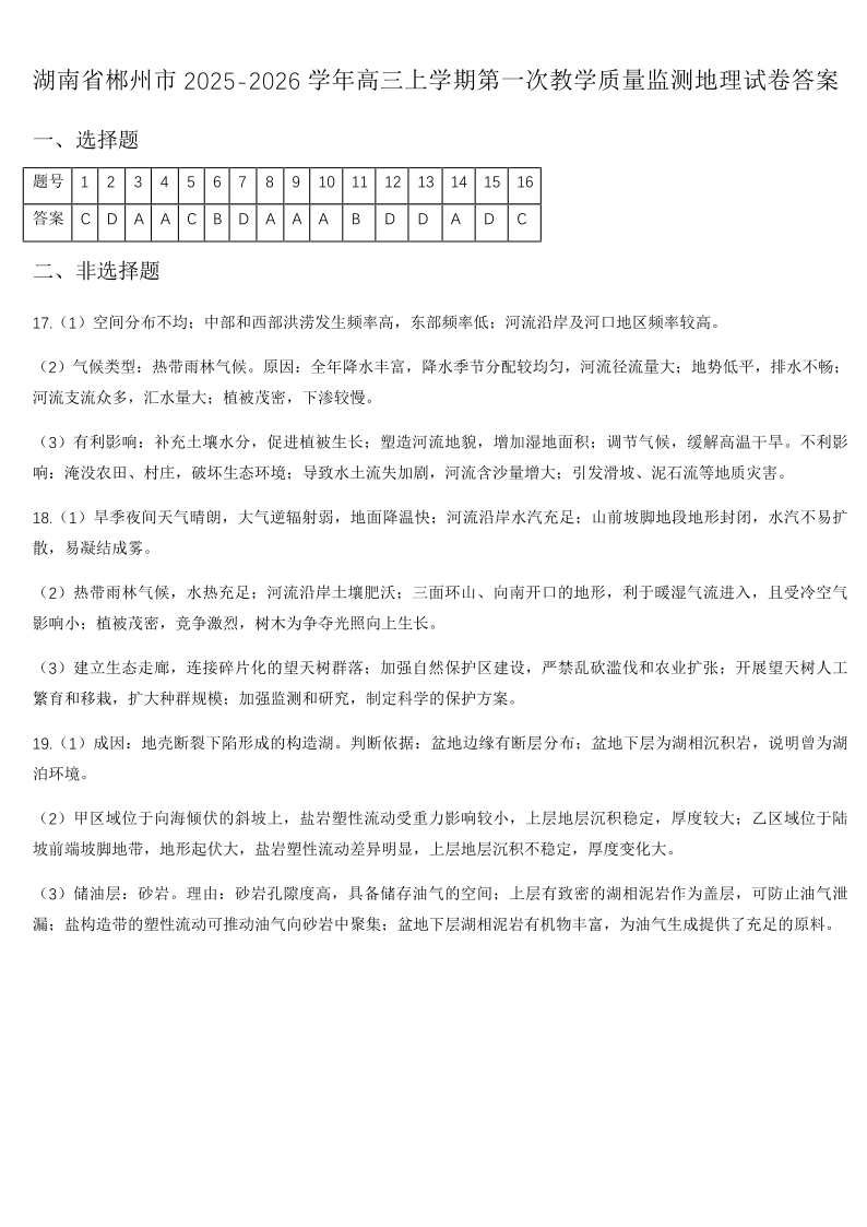 郴州市2026届高三第一次教学质量监测试卷 地理答案.pdf