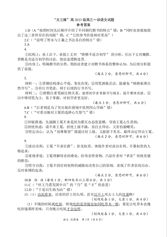 “元三维大联考”2023级高三第一次诊断考试 语文答案.docx