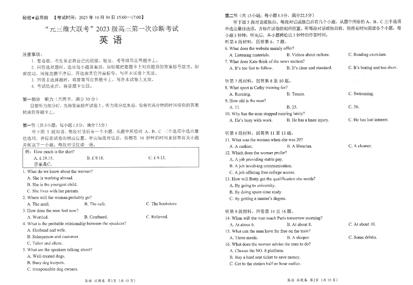“元三维大联考”2023级高三第一次诊断考试 英语.pdf