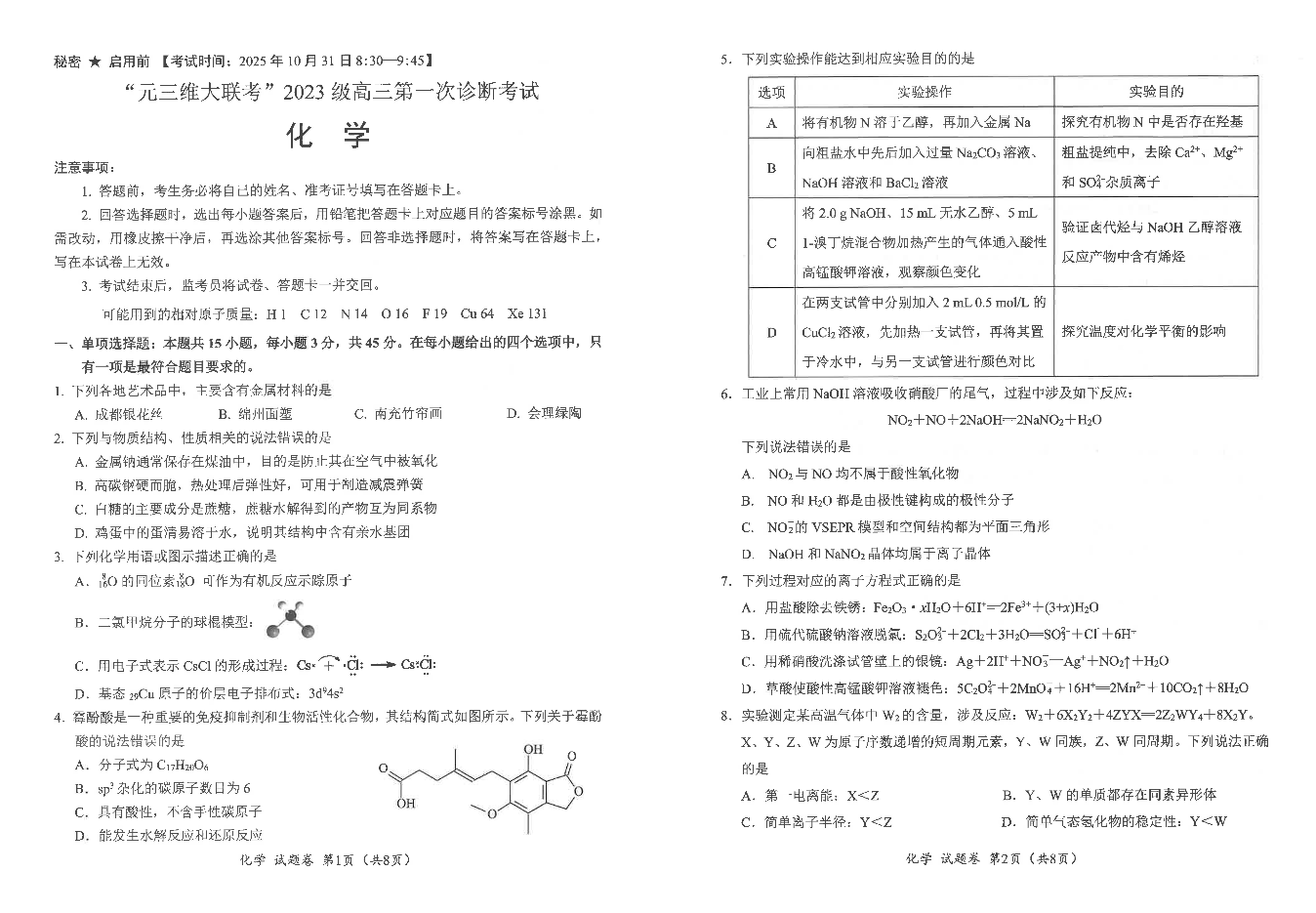 “元三维大联考”2023级高三第一次诊断考试 化学.pdf
