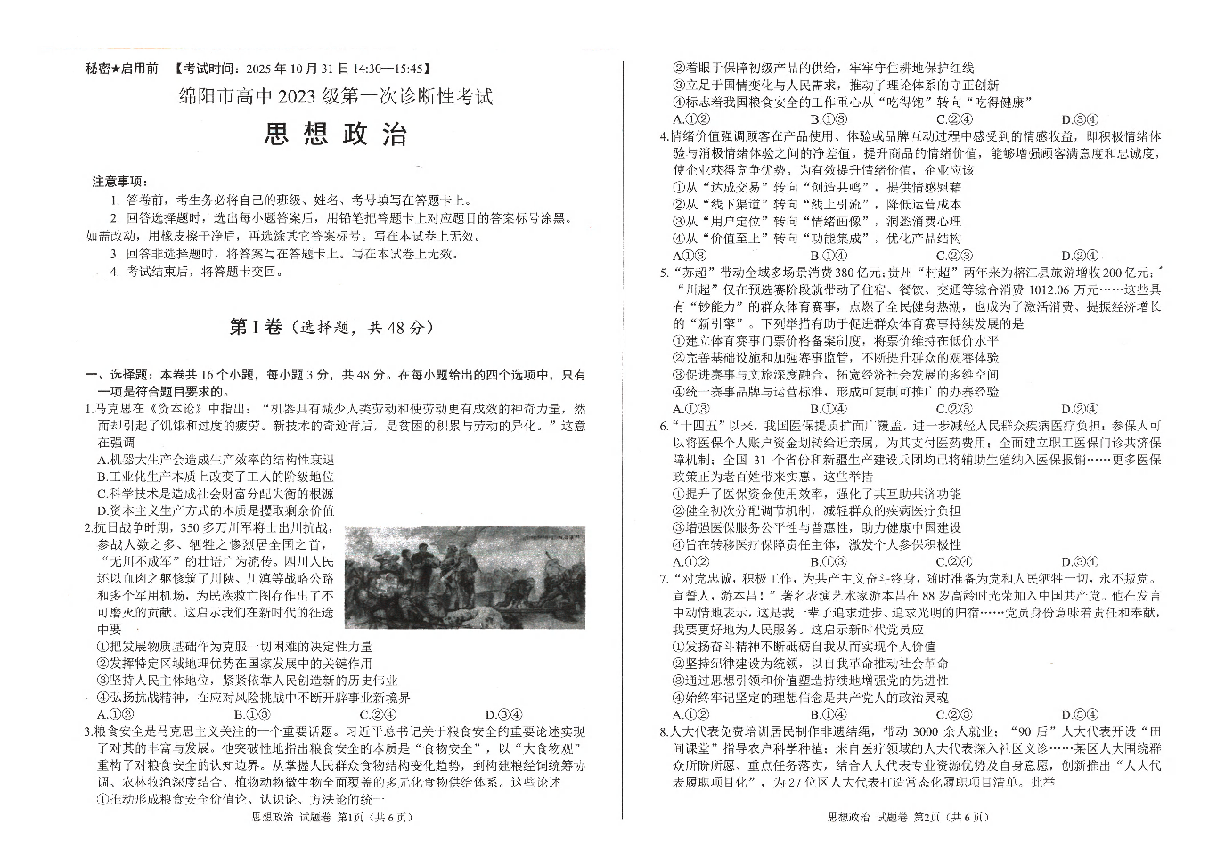 绵阳市高中2023级第一次诊断性考试 政治.pdf