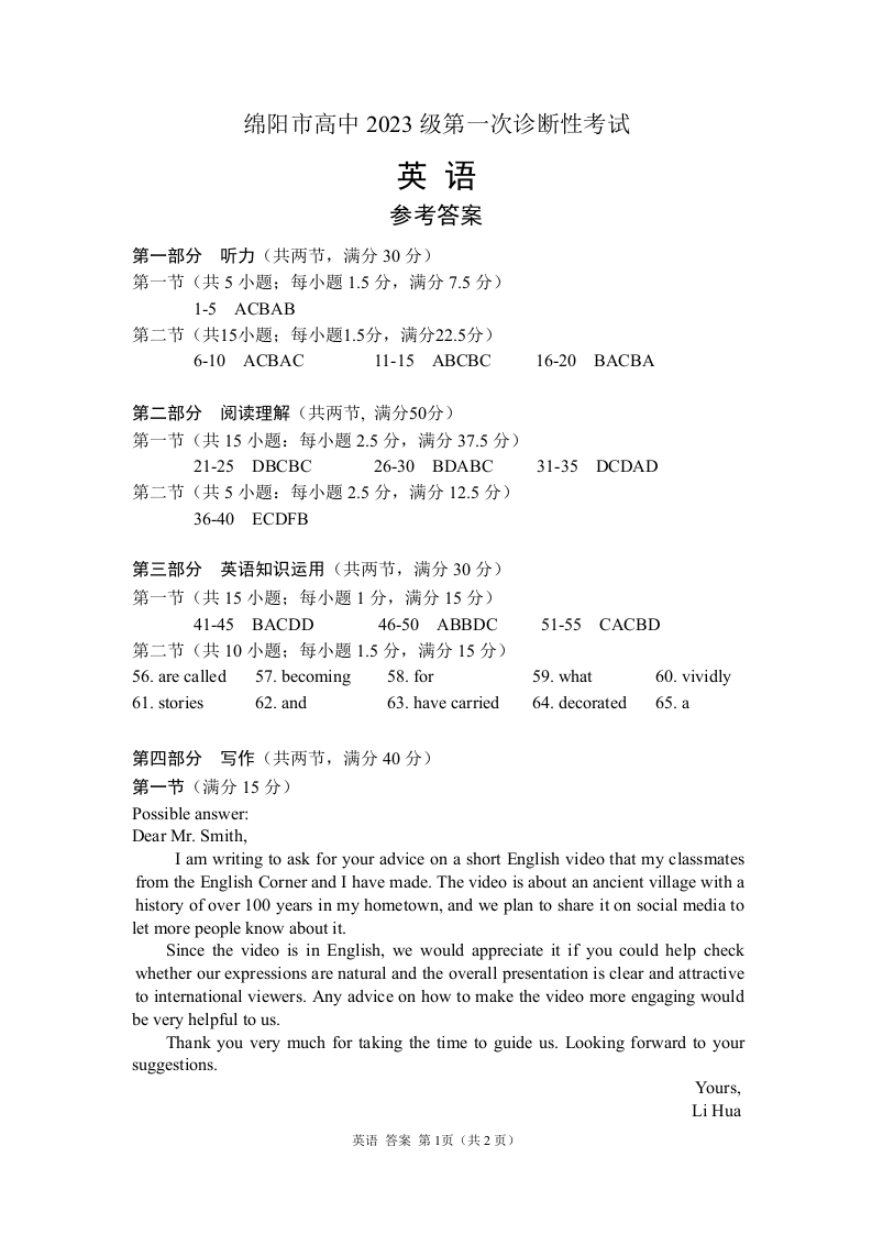 绵阳市高中2023级第一次诊断性考试 英语答案.docx