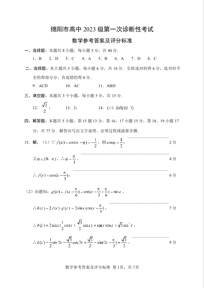 绵阳市高中2023级第一次诊断性考试 数学答案.docx