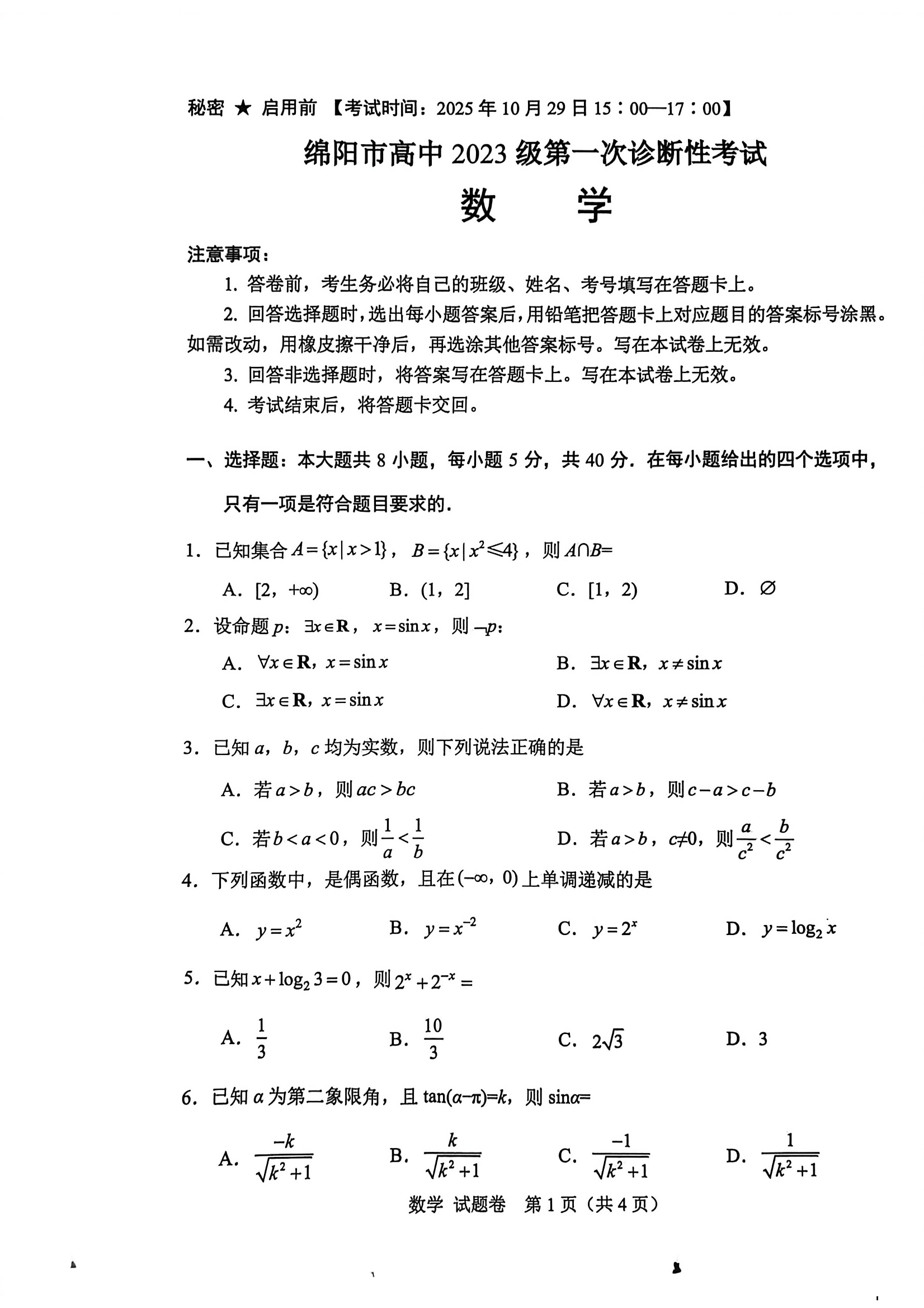 绵阳市高中2023级第一次诊断性考试 数学.pdf