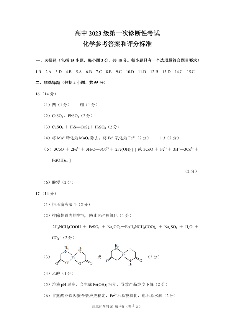 绵阳市高中2023级第一次诊断性考试 化学答案.docx