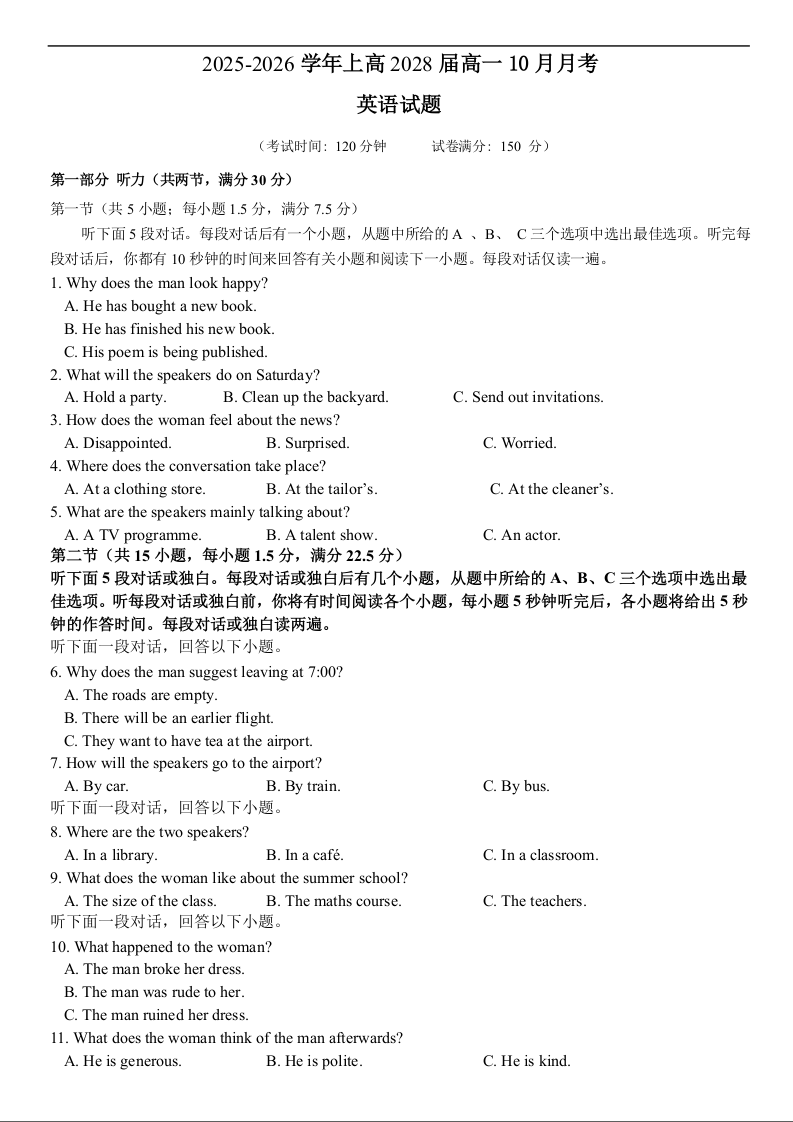 四川省内江市第一中学2025-2026学年高一上学期第一次月考 英语试题(含答案).docx
