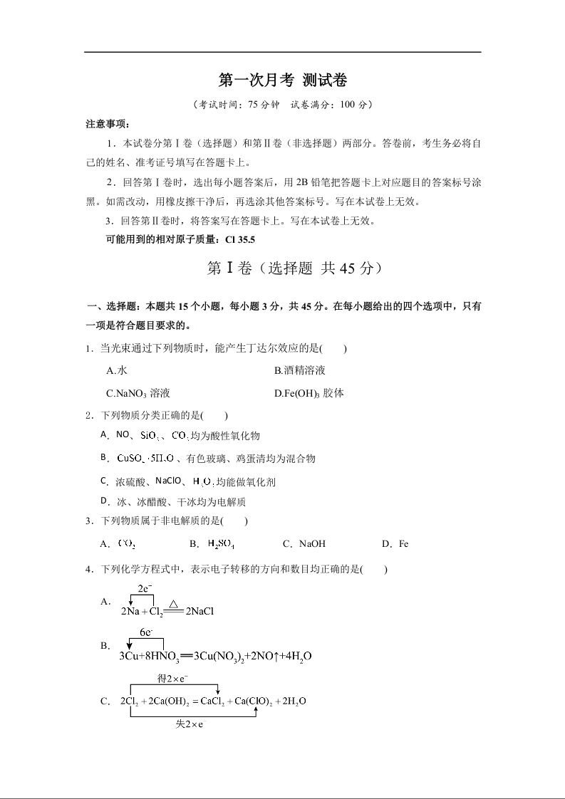四川省内江市第一中学2025-2026学年高一上学期第一次月考 化学试题(含答案).docx