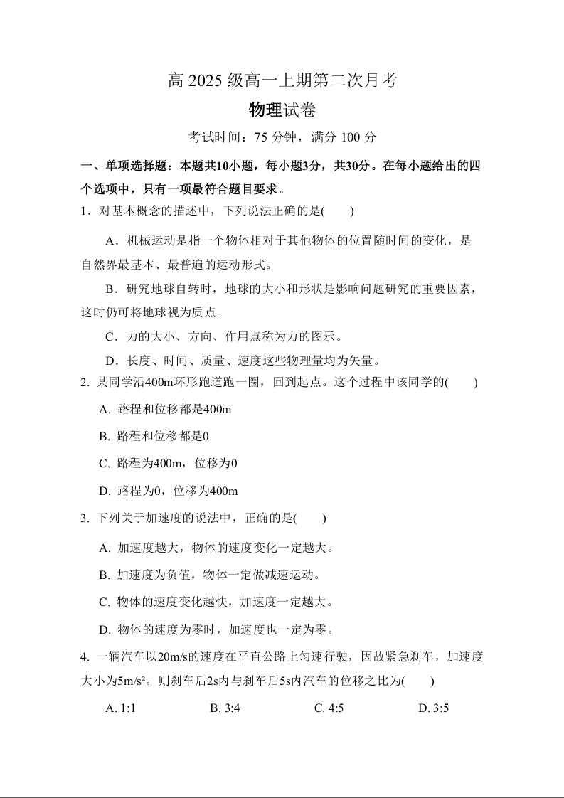 四川省南充市嘉陵第一中学2025-2026学年高一上学期第二次月考 物理试题(含答案).docx
