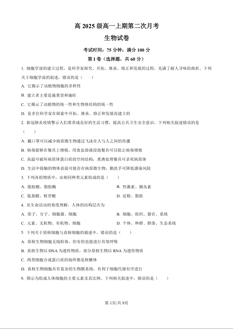 四川省南充市嘉陵第一中学2025-2026学年高一上学期第二次月考 生物.docx