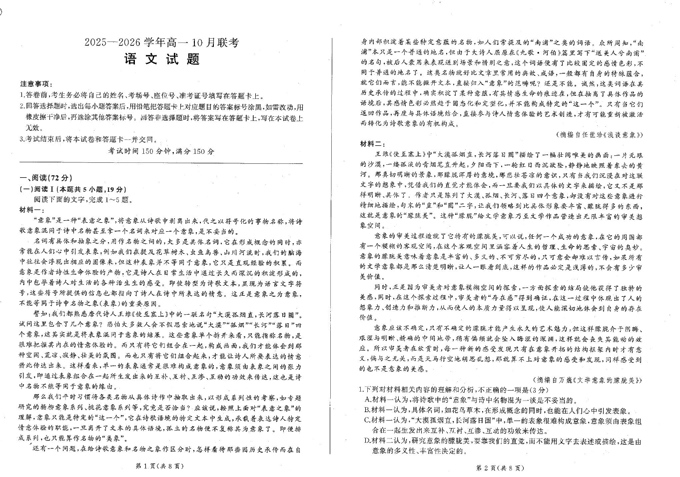 辽宁省朝阳市重点高中2025-2026学年高一上学期10月联考 语文试题(含答案).pdf