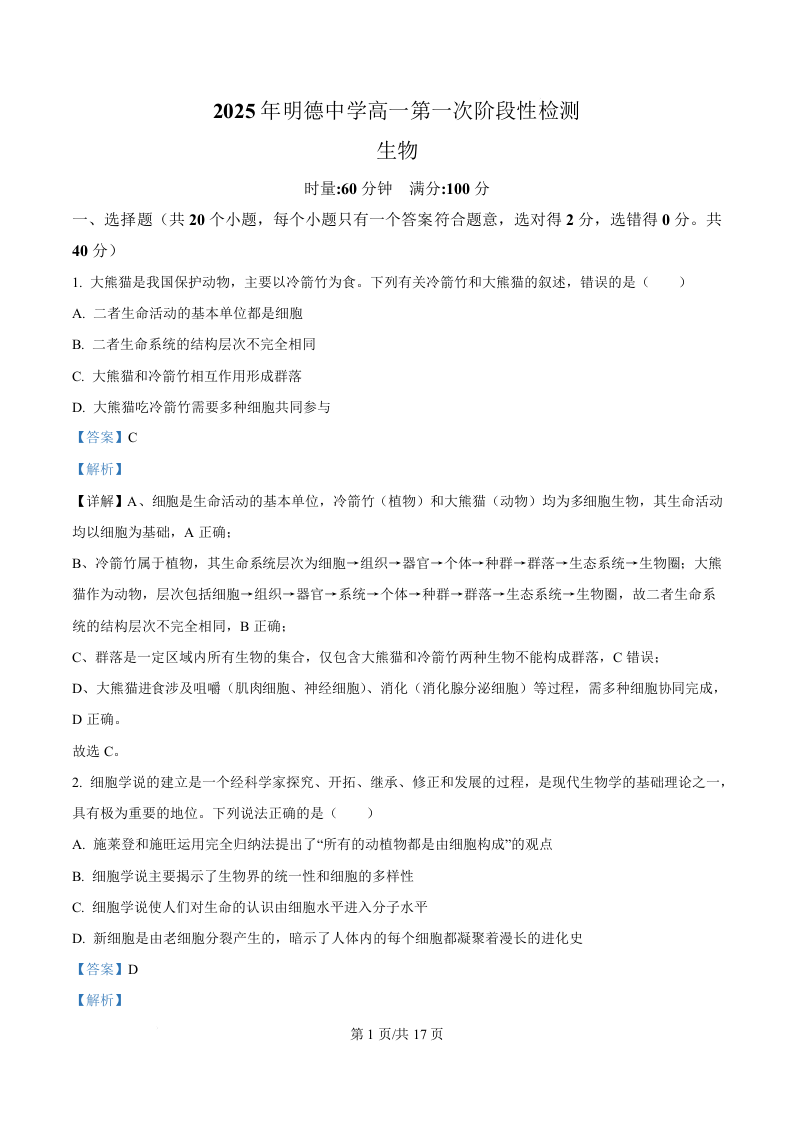 湖南省长沙市明德中学2025-2026学年高一上学期10月月考 生物答案.docx