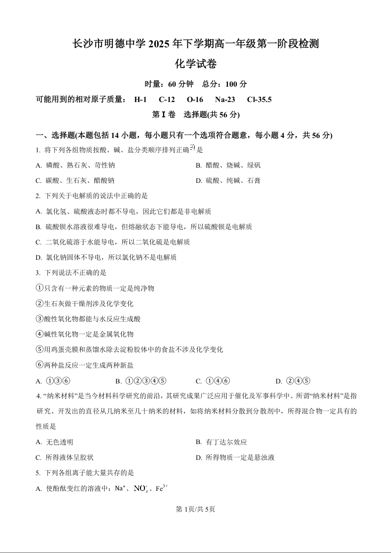 湖南省长沙市明德中学2025-2026学年高一上学期10月月考 化学.docx