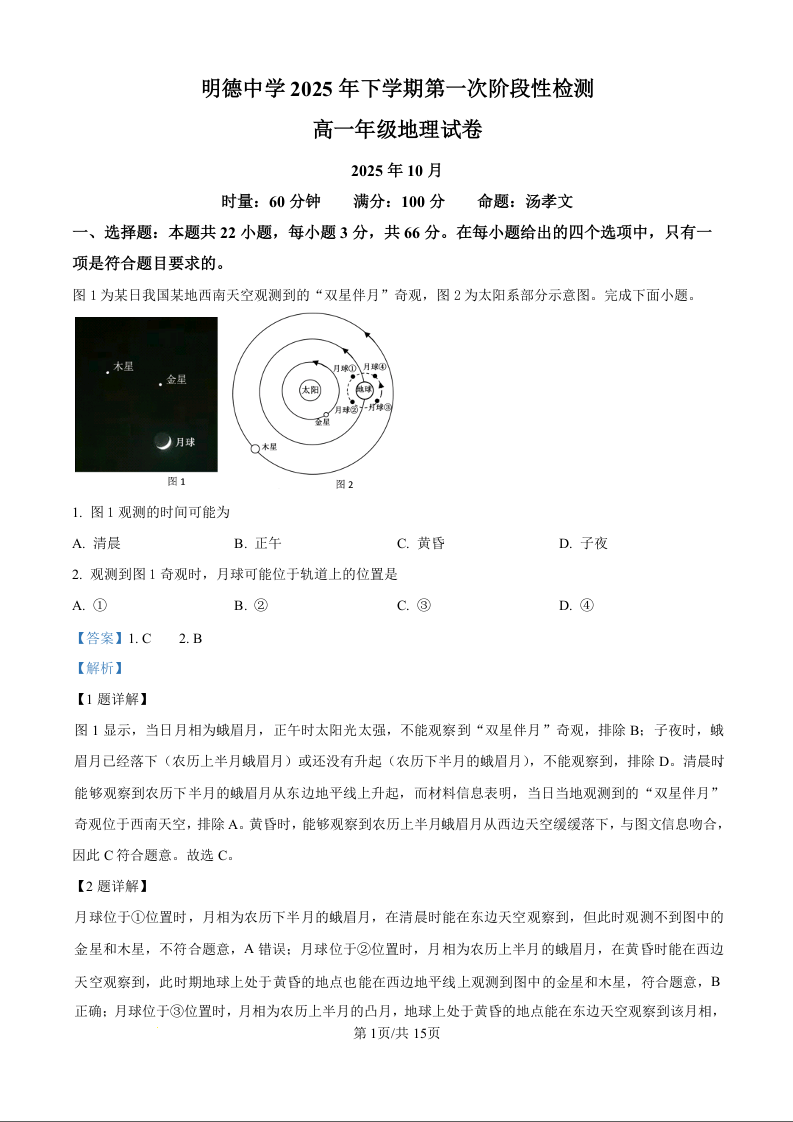 湖南省长沙市明德中学2025-2026学年高一上学期10月月考 地理答案.docx