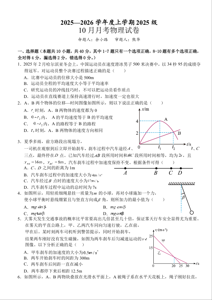 湖北省荆州市沙市中学2025-2026学年高一上学期10月月考 物理试题(含答案).docx