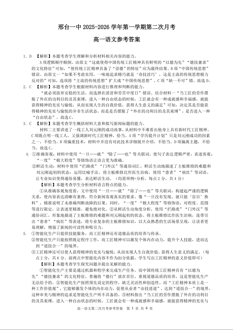 河北省邢台市2025-2026学年高一上学期10月第一次月考 语文答案.docx