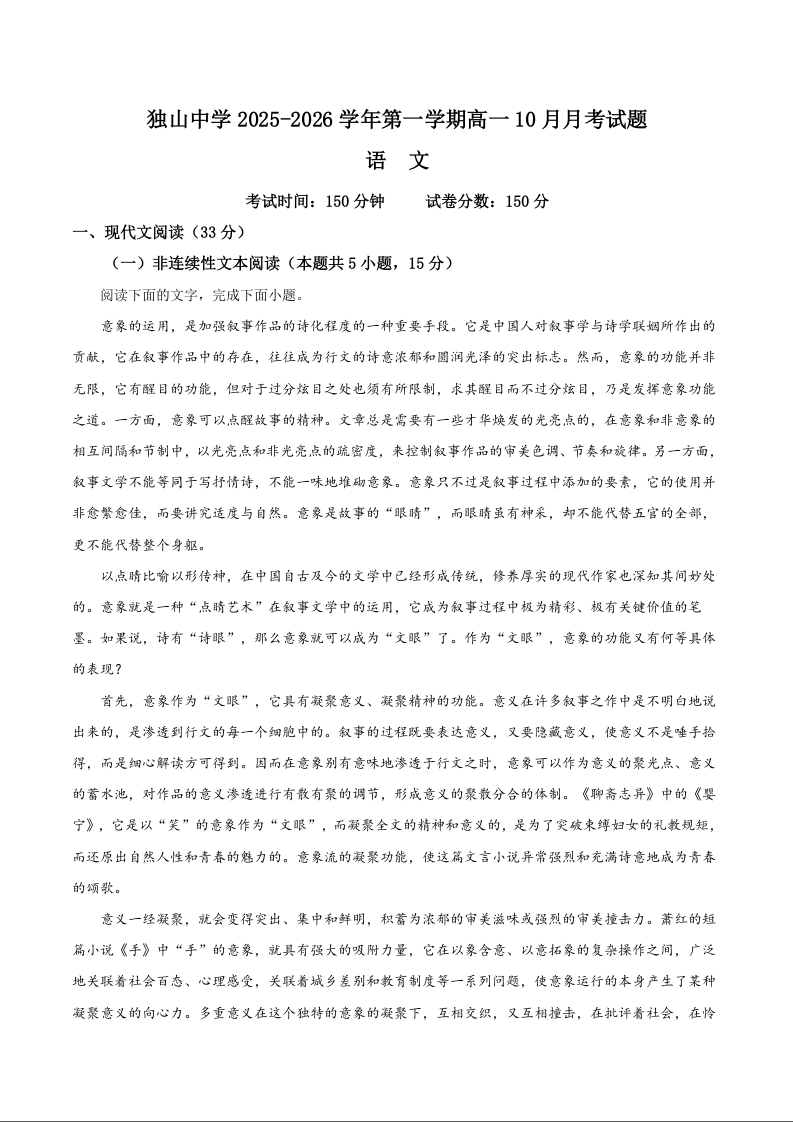安徽省六安市独山中学2025-2026学年高一上学期10月月考 语文试题(含答案).docx