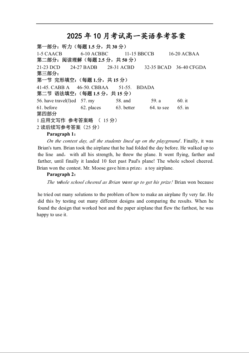 安徽省六安市独山中学2025-2026学年高一上学期10月月考 英语答案.docx
